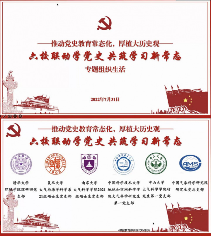 2022年7月31日,由复旦大学大气和海洋科学系2021级研究生党支部倡议,中国科学技术大学与清华大学、南京大学、中山大学以及中国气象科学研究院六所高校大气科学相关专业的研究生党支部共同开展云端共建活动,以“六校联动学党史,共筑学习新常态”为主题,开展党史学习教育,讲述青年党员的使命担当,分别围绕“经验分享、勿忘历历来时路”;“赓续红色血脉、汲取奋进力量”;“立足专业、党史宣讲共研学”;“把握精髓,专题交流悟感想”;“合作倡议、学习新常态”等五个方面深入交流。