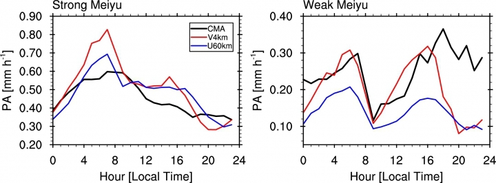 因此在本研究中,赵纯教授团队首次使用了全球变分辨率大气模式来模拟华东地区的梅雨降水的日变化,该模式结合了区域模式高分辨率和全球大气环流模式不需要区域边界条件限制的优点。研究设置了一组在中国东部加密到4km的实验(V4km),和一组全球均一分辨率60km(U60km)的实验,结果表明两组实验都可以较好地模拟出梅雨季降水量的空间分布,但是V4km能够更好地重现降水强度和降水频率,说明对流解析尺度的模拟对于预报夏季间断性的强降水和洪涝有更好的指示意义。同时,由于2015年的梅雨季经历了大气环流形势的转变,研究发现在强梅雨时期,降水日变化呈现出一个凌晨的峰值,主要由夜间西南风急流所调控,两种分辨率对强梅雨时期降水日变化的模拟差异较小。在弱梅雨时期,降水日变化呈现出一个凌晨和一个午后的峰值,分别是由夜间西南风急流和午后局地对流共同调控,相对于U60km,V4km能够更好地模拟出弱梅雨时期多尺度过程控制下的降水日变化。