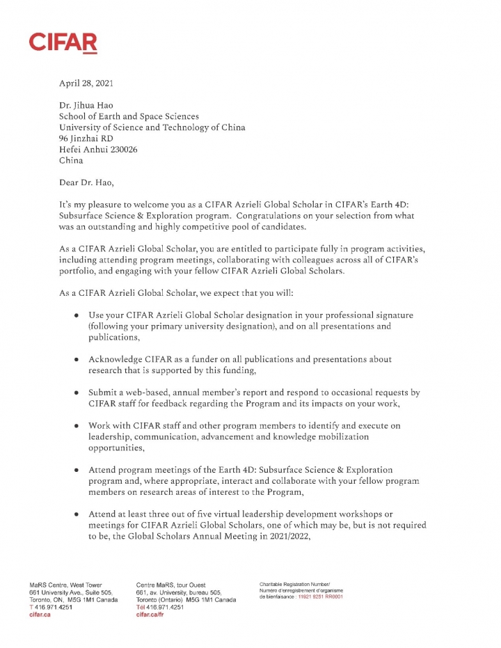 2021年5月26日,中国科学技术大学郝记华特任研究员荣获加拿大高等研究院(CIFAR)颁发的2021年度全球学者(CIFAR Azrieli Global Scholar)奖。这是该奖项历史上首次颁发给中国大陆高校的学者。今年全球共有17名青年学者获得该奖项,其中地球与行星科学领域3名。