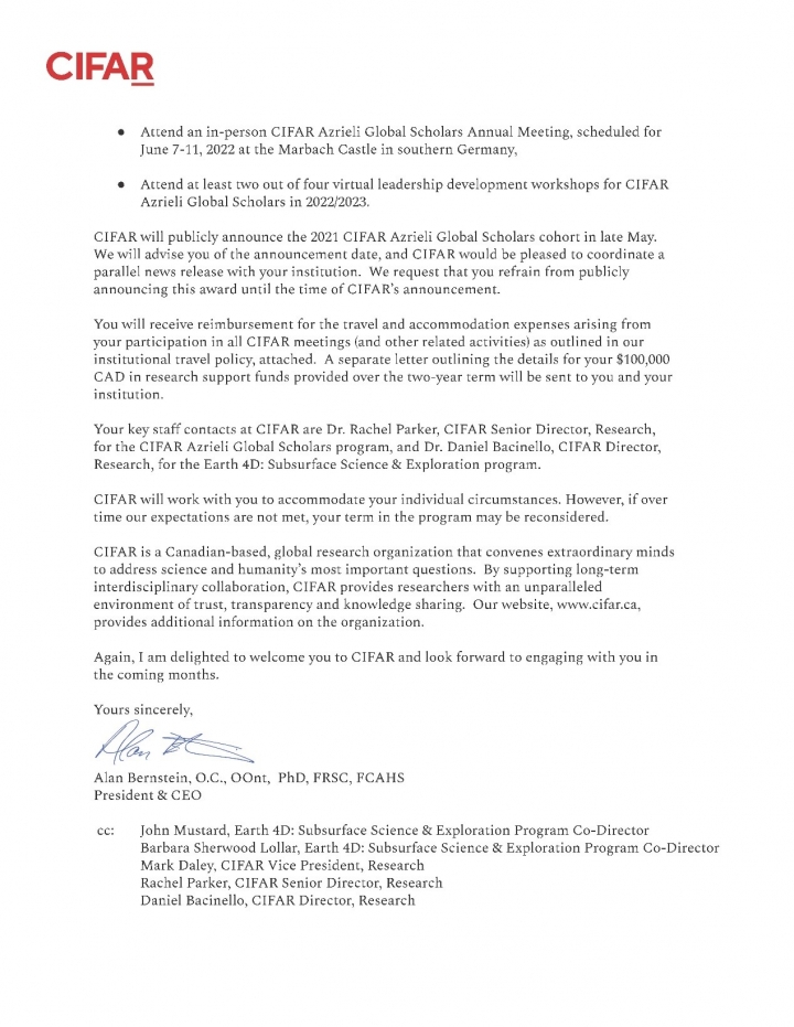 加拿大高等研究院Azrieli全球学者奖(CIFAR Azrieli Global Scholars)旨在为处于学术生涯关键期的青年研究人员提供100,000加元资助(非指定项目),受聘CIFAR研究项目两年,并提供专项领导力及沟通培训等帮助,以帮助其构建科研网络,激发科研创新。全球申请者入选比例约为6%。