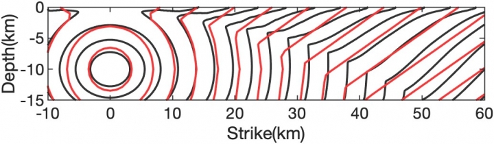 为了更好的理解自由地表形成的子破裂,图三对比了随深度变化应力下破裂前锋的分布图(黑线)和一种假定模型下的破裂前锋分布(红线);这种假定模型中,当P波或者P到SV转换波传播到断层上任一质点,破裂开始(这里仅考虑到时,不考虑破裂过程)。结果显示在靠近地表区域假定模型对应的子破裂前锋比实际模型要慢,而在断层深部区域二者重合度较好,因此,在靠近地表区域,Kaneko & Lapusta(2010)提出的SV到P的转换波可能在子破裂的形成中起到更主要的作用。
