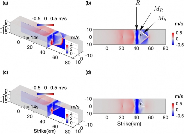 对比二者的近场地表速率(图二)可见,均匀应力模型下的地表超剪切破裂引起的马赫波清晰可见,而随深度变化应力模型下的子破裂并没有在地表产生可观测到的马赫波。
