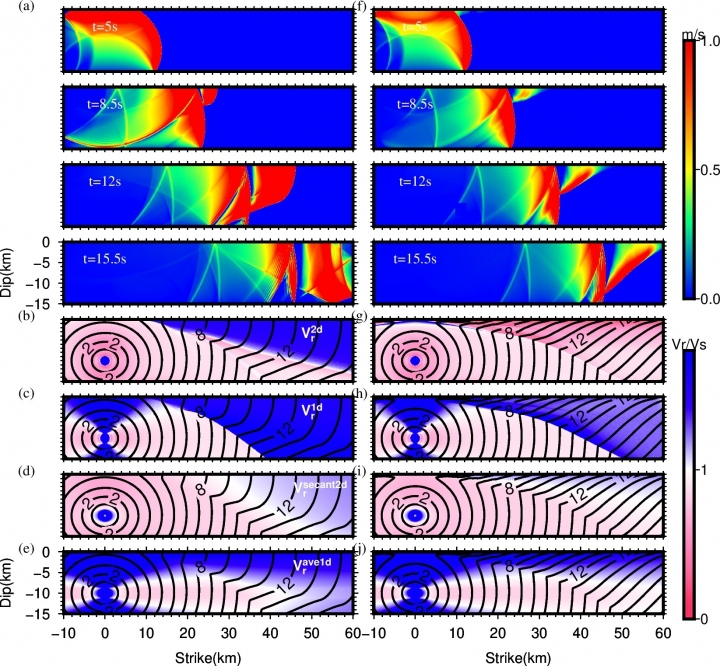 胡峰等人复现了Kaneko & Lapusta(2010)论文中两个走滑平面断层上自由地表诱发超剪切破裂的例子。如图一所示,图一a和一f分别为均匀应力和随深度变化应力下的发震断层上的不同时刻的滑动速率分布,可见两个破裂传播到自由地表后均出现子破裂,且和Hu et al. (2019)发现的不可持续超剪切破裂不同,这里的子破裂均随着破裂的前进持续传播到断层底部。然而,图一还比较了四种不同的破裂速率在断层面上的分布,包括二维瞬时破裂速率Vr2d