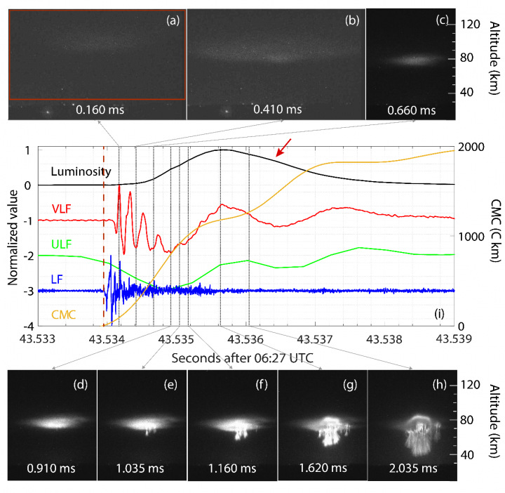 图2 (a-h)发生在2013年6月12日晚世界时0627:43 UTC的事件A的高速光学图像;(i)事件A的高速光度变化波形,射频磁场信号波形和反演得到的电荷矩(CMC)波形,红色垂直虚线代表回击的开始时间。