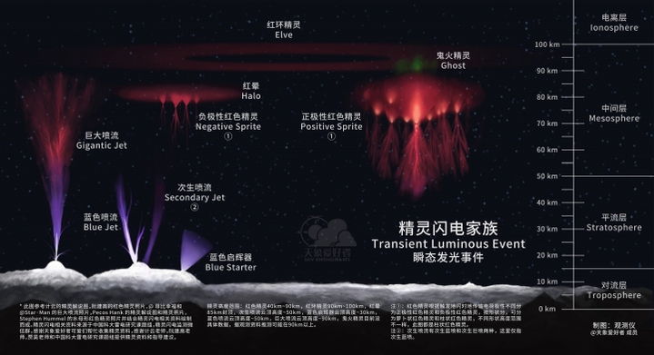 图1 由天象爱好者团队制作的中高层瞬态发光现象示意图(图片来源:https://mp.weixin.qq.com/s/sMJgNDJnbnnGSXQVSIp_KA)