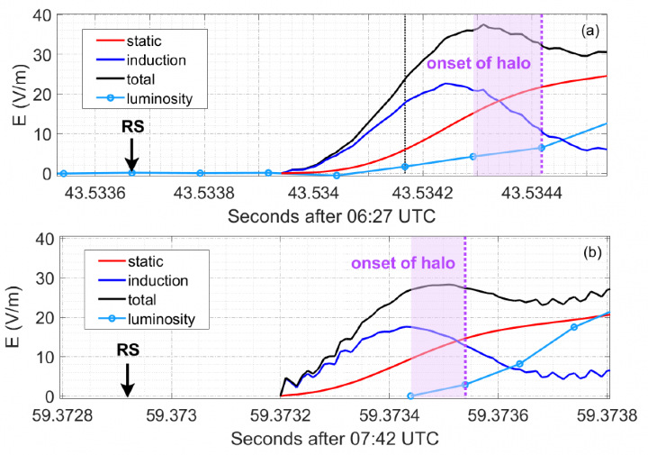 图3 (a)地闪回击在事件A的光晕起始高度处的扰动电场;(b)地闪回击在事件B的光晕起始高度处的扰动电场。光度曲线上的空心圆时间代表高速相机捕捉到精灵图像的时间,黑色箭头代表回击(RS)开始时间。