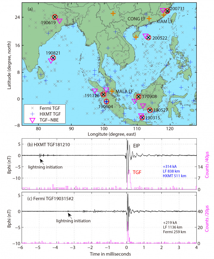 图1 (a) 领先NBE发生的TGF事件空间分布; (b-c)闪电近地空间效应研究平台马六甲测站附近观测到的两个近距离TGF事件,其与云内大脉冲放电过程(energetic in-cloud pulse,EIP) 同步发生,其中图b中个例由中国第一颗空间天文卫星“慧眼”硬X射线调制望远镜(Insight-HXMT)所探测。