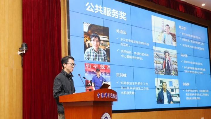 会议第二阶段为校友基金发展奖颁奖仪式,执行院长汪毓明主持会议。2020年度发展基金奖项颁奖获奖者情况为:郭致远、冼锦洪、任德馨三位同学荣获2020年度学院发展基金院长奖;孙道远、贺剑峰、戴立群、陈伊翔、侯振辉五位老师荣获公共服务奖;刘奇、刘贻灿、高晓英、李王晔四位老师荣获优秀教学奖;席道瑛、陈道公两位老师荣获杰出教学成就奖;施行觉老师荣获突出贡献奖。汪毓明、刘斌为获奖老师颁奖。