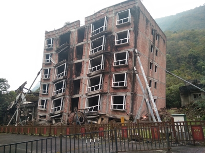 11月13日,赴往彭州白鹿中学、小鱼洞大桥、龙门山地质公园进行考察。白鹿中学两排教学楼正好处于断层两侧,地震发生后上下盘移动以至高度落差高达三米,建筑物却完好无损,全体师生安全逃脱,堪称奇迹,因此也称其为“最牛教学楼”。