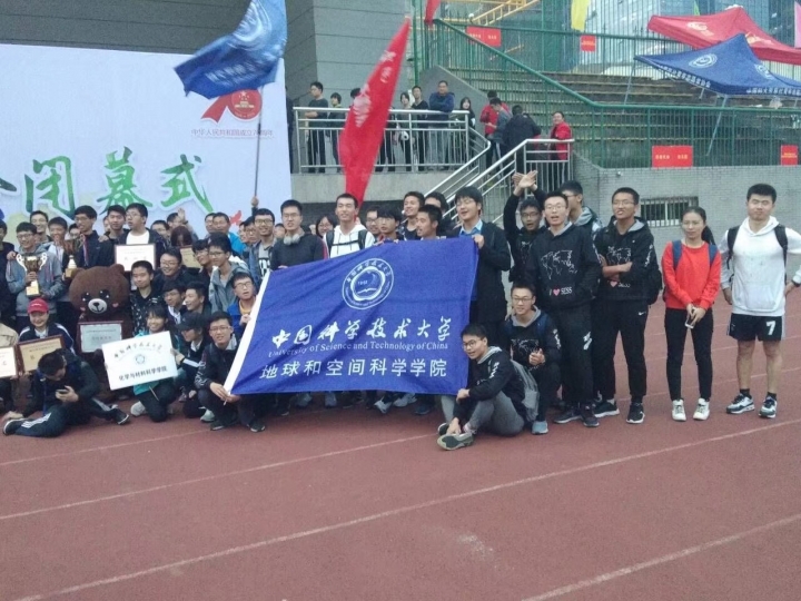 25日清晨,学院学生后勤人员布置好看台,就和运动员、院内其他学生一起参加各学院的方阵。本院方阵清一色的黑色卫衣,显示着地空学院的低调有内涵。胸前是简化版世界地图,暗示着地球科学;腹前口袋上面绣着“ISESS”字样,预示着院内学生热爱本学院。背后绣着航天器图样以及“SESS of USTC”字样,显示着空间物理的魅力。左臂上绣有的“仰望星空”字样是地空学院一直以来的初心。响亮的口号“青春无畏,逐梦扬威;地空学子,展翅高飞!”所表达的气魄和前排同学手持的横幅上的标语所传递的精神不谋而合:“脚踏实地,仰望星空;拼搏进取,终见彩虹!”
