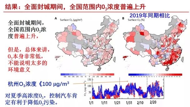 研究表明,疫情封城措施导致交通流量的大幅下降对我国空气质量影响显著,NO2和PM2.5浓度和交通流量存在显著的线性相关性。除此之外,俞教授还对推广电动汽车对我国空气质量的影响进行了模拟。结果显示,电动汽车的全面推广能够使我国中部和东南部大部分地区的PM2.5浓度下降30-70%;NO2浓度降幅则更加明显,达到40-90%。