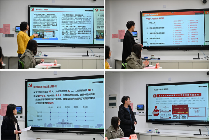 接着,王兴金、吴振豪、严子婧、姜玲玲四位党支部骨干根据各自党支部的工作经历,交流经验,分享心得,突出问题,研讨解决。随后,王秀婷、张展铭、胡亚新和王新乐四位党员代表围绕党的二十大精神,分享自己的学习心得和感悟。