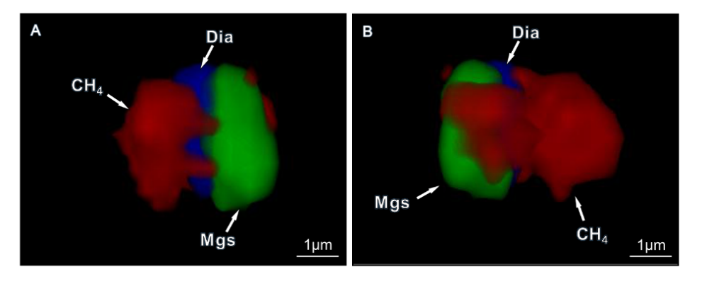 图二: 金刚石-菱镁矿-甲烷多相包裹体三维拉曼显微图。其中,Dia:金刚石;Mgs:菱镁矿;CH4:甲烷