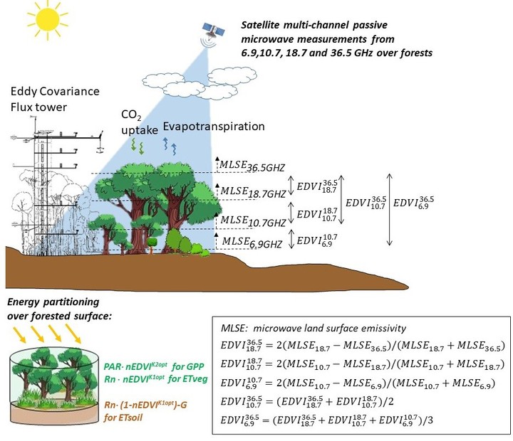 图2:利用原位站点和卫星多通道微波协同遥感森林碳水通量概念图(Wang et al., 2023)。
