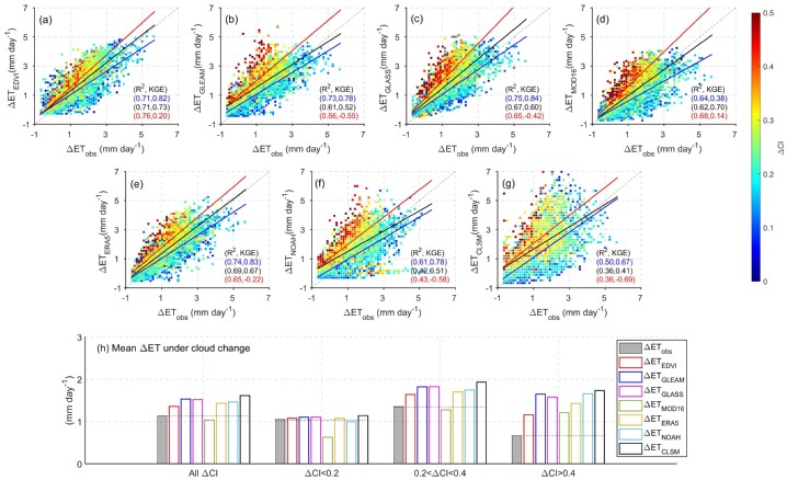 图3:云引起的ET变化(ΔET,云天和晴空ET的差值)在东亚二十个通量站点的验证。(a)-(g)为七个ΔET数据集在不同云量指数变化(ΔCI,云天和晴空CI的差值)下的验证结果。散点填色代表ΔCI,蓝色表示较小云量变化,红色表示较大云量变化。蓝色、黑色和红色直线和统计指标分别表示在较小云盖变化 (ΔCI < 0.2),中等云盖变化(0.2 < ΔCI < 0.4)和重度云盖变化(ΔCI > 0.4)下的线性回归结果。(h)展示了不同云量变化下的ΔET和站点实测平均值(灰色)的比较(Wang et al., 2023)。