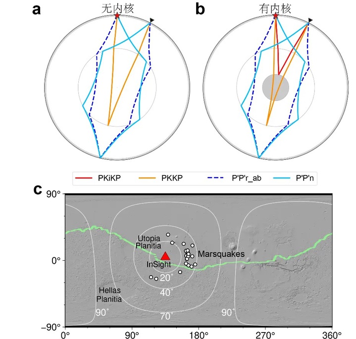 为突破这一挑战,研究团队创新性地引入火震阵列分析方法,通过对23个信噪比较高的火震事件数据的分析,成功提取出穿过火星核的关键震相,如在地表反射的PKPPKP(P'P')和在核幔边界反射的PKKP(下图a)。特别值得注意的是,实际观测到的PKKP到时,较当前仅考虑液态核的火星速度模型所预测的结果提前了50至200秒。地震波在固体中的传播速度比在液体中快。因此,这一差异表明,火星核具有分层结构:即外层为液态核,而更深部则存在一个波速更高的固态内核。