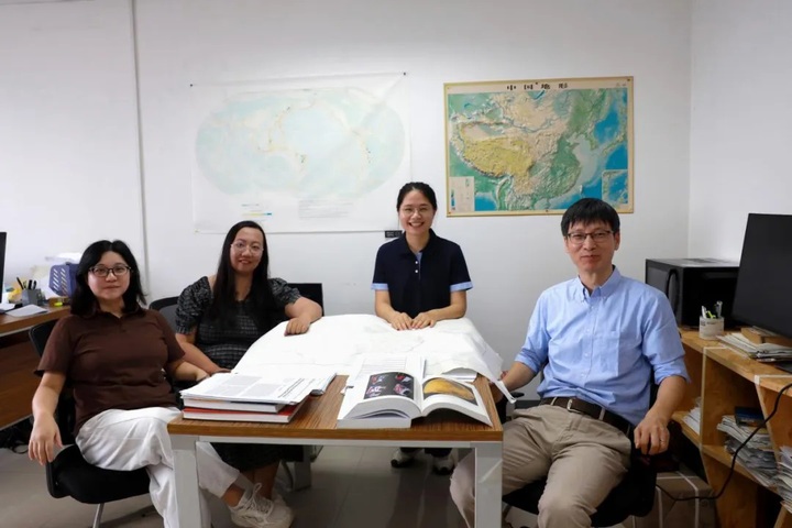 中国科大教授孙道远(左一)与团队成员讨论研究进展