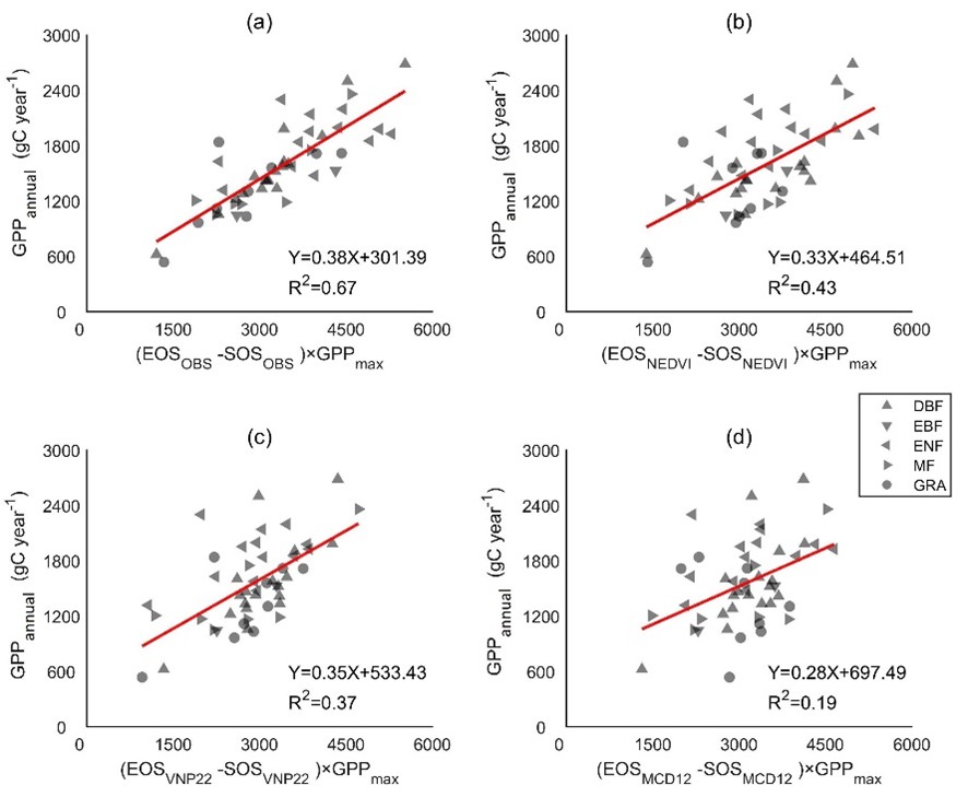 图3:森林和草地站点年总量GPP与卫星反演生长季长度和季节最大碳吸收能力乘积之间的统计关系(p<0.01)。