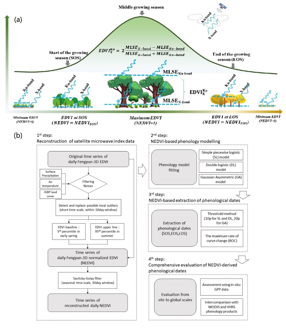 图1:(a) 利用FY-3D双通道微波EDVI与NEDVI监测植被物候期的示意图。(b) 基于FY-3D NEDVI的植被物候期提取框架及其验证流程。
