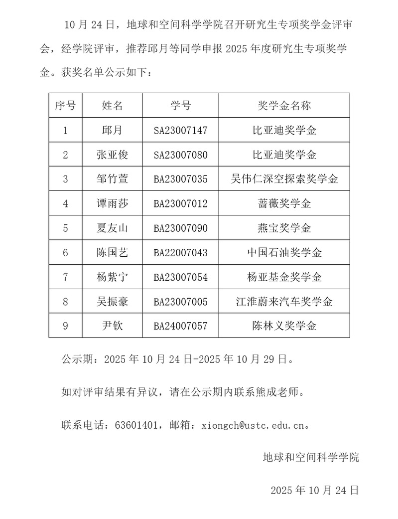 地球和空间科学学院2025年度研究生专项奖学金获奖名单公示