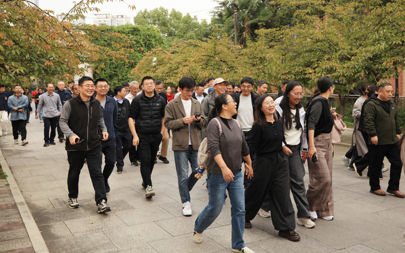沐浴着秋日暖阳,老师们精神抖擞,结伴而行。长长的队伍成为校园里一道流动的风景线。大家边走边聊,气氛轻松愉快,首站抵达郭沫若像前并合影留念。队伍随后途经图书馆、东活广场、物质楼等地标,最终抵达本次活动的终点——地球和空间科学学院前沿研究中心。