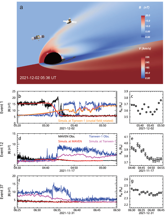 弓激波是天体与行星际太阳风相互作用的第一道界面,其动态变化的行为不仅反映了太阳风对天体的扰动影响,还反映了天体本身的磁场和等离子体特性,是理解天体空间环境状态和变化规律的重要交界面。近日,中国科学技术大学汪毓明教授领衔的国际研究团队,利用我国首次火星探测任务“天问一号”环绕器的磁场和等离子体观测数据,结合美国MAVEN探测器的观测数据,在火星弓激波对太阳风响应方面取得重要进展。研究成果以“Bow Shock Oscillations of Mars Under Weakly Disturbed Solar Wind Conditions”为题,发表在《自然·通讯》(Nature Communications)上。