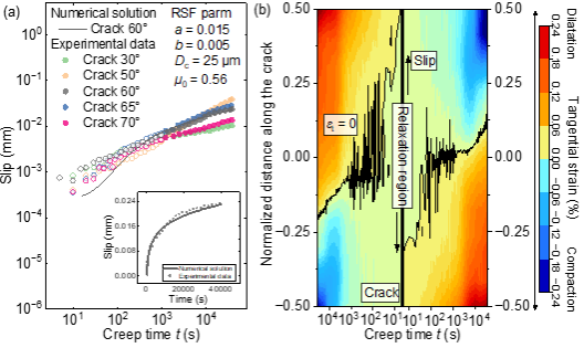 针对上述科学挑战,研究团队首先设计了恒定低荷载蠕变实验,模拟自然界中长期构造力的作用。实验采用脆性聚苯乙烯材料制备含预制闭合裂纹的试样,通过数字图像相关(DIC)技术精确测量裂纹周围的微应变演化,首次在缓慢滑动阶段直接观测到两个关键过程(图1):一是裂纹界面在低于破裂强度的恒定应力水平下发生自相似的持续滑移;二是此过程伴随着持续的剪应力松弛并向裂纹尖端方向转移,表现为裂纹膨胀区向初始压实区的逐步扩展,引发尖端局部应变的持续累积。