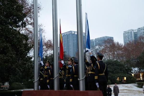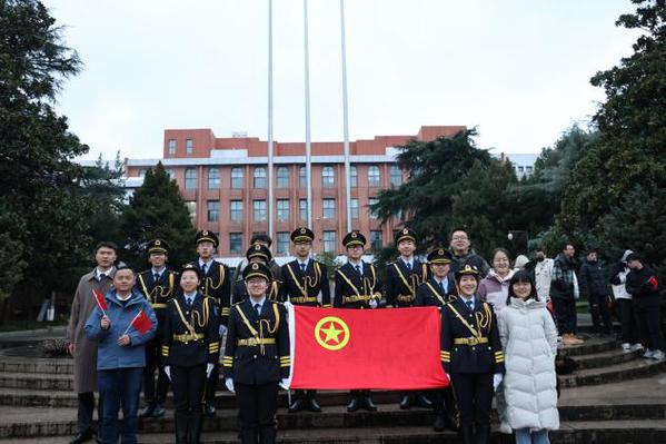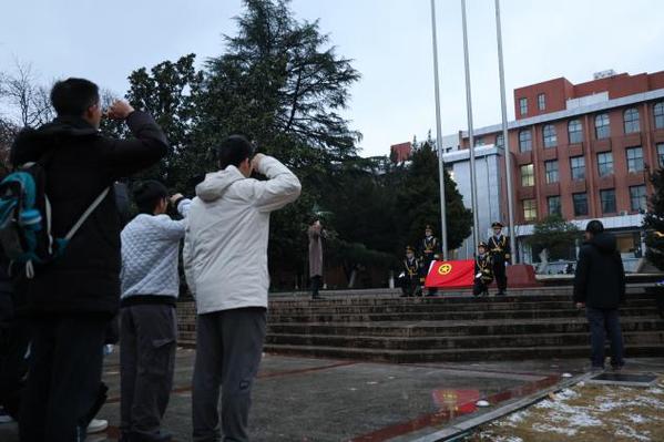 新年将至,万象更新。为激励和引导广大师生校友大力弘扬以爱国主义为核心的伟大民族精神,用奋进之姿开启新年征程,奋力谱写以青春担当共筑中国梦、以团结拼搏创造新辉煌的时代篇章,2026年1月1日早晨7:00,我校2026元旦升旗仪式暨地空学院升旗进支部活动在东区郭沫若广场顺利举行。初雪映衬下,地空学院师生代表与广大校友齐聚一堂,在庄严肃穆的氛围中共同见证国旗升起,迎接新年的到来。