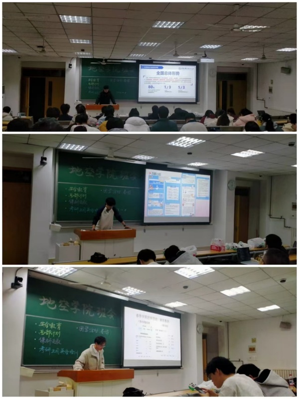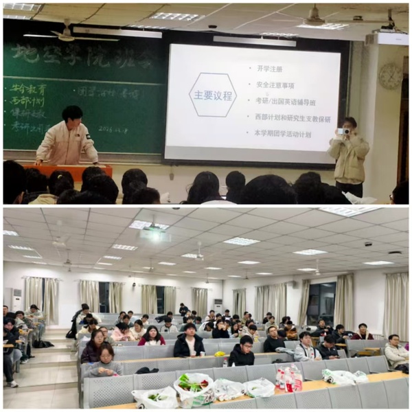 2026 年3月18日,地球和空间科学学院2023级本科班全体学生于第一教学楼1101教室召开专题班会。本次班会由23级本科1班班主任党童、2班班主任夏琼霞共同主持,聚焦网络安全意识提升与升学规划指导两大核心内容,同时明确团日活动安排,为年级学生成长发展与班级建设夯实基础。