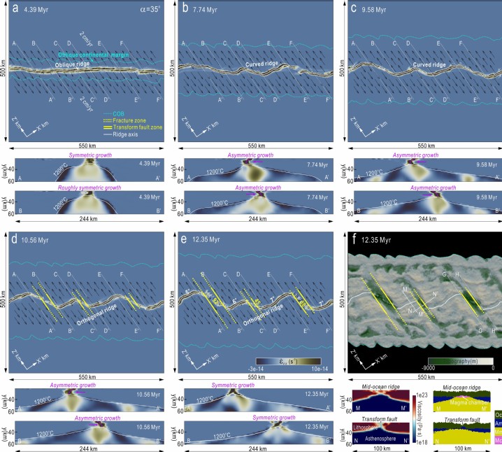 研究团队通过三维岩浆-热-力学耦合的数值模拟,系统研究了倾斜伸展背景下从大陆裂谷到海底扩张的完整演化过程。模拟结果显示,继承自倾斜大陆边缘的倾斜洋中脊在慢速/超慢速海底扩张条件下表现出动力学不稳定性,会通过极性交替的非对称板块生长(拆离断层作用),逐渐发生弯曲并自发形成转换断层,最终重组为正交的洋中脊段和转换断层系统(图2)。模拟结果较好的再现了亚丁湾、东南印度洋及赤道大西洋等区域洋中脊段的自组织现象。