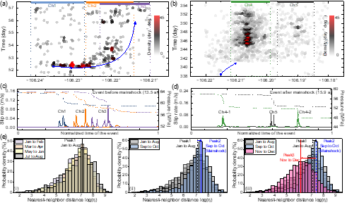 图2主震前后地震间相互作用机制的转变。(a, b) 主震前后两个代表性震群的时空分布演化特征。(c, d)模拟的主震前后震群活动及其滑移速率和孔隙压力演变。(e)2008年震群活动的最邻近聚类统计。