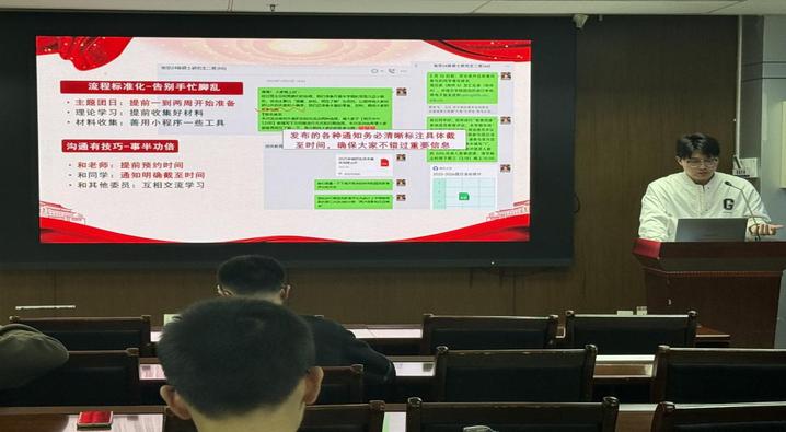 最后一位上台分享的团学骨干是地空学院24硕2班团支书贾吉飞,他代表班级团支部,围绕团学日常管理,分享了规范工作流程、提高工作效率的实用方法。内容务实具体。重点突出。