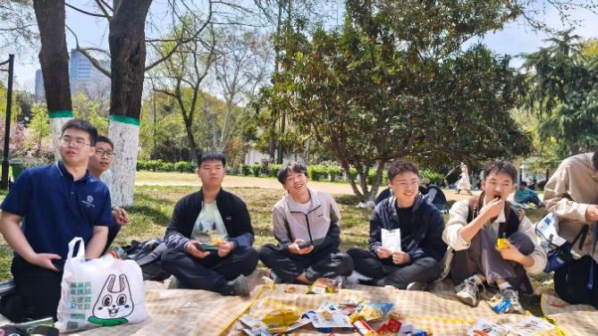 寻得草坪一片,铺展好野餐垫,大家围坐在一起,开启了悠闲的春日休憩时光。有的同学惬意静卧,享受片刻的闲适;有的同学围坐畅谈,分享趣事、聊聊理想与规划,欢声笑语交织,尽显同窗情谊。为进一步活跃气氛,班委精心组织了多项趣味互动小游戏,同学们踊跃参与、默契配合,在游戏中相互协作、彼此打趣,轻松欢快的氛围感染着每一个人,拉近了同学间的距离,更让班级的凝聚力在欢声笑语中悄然提升。