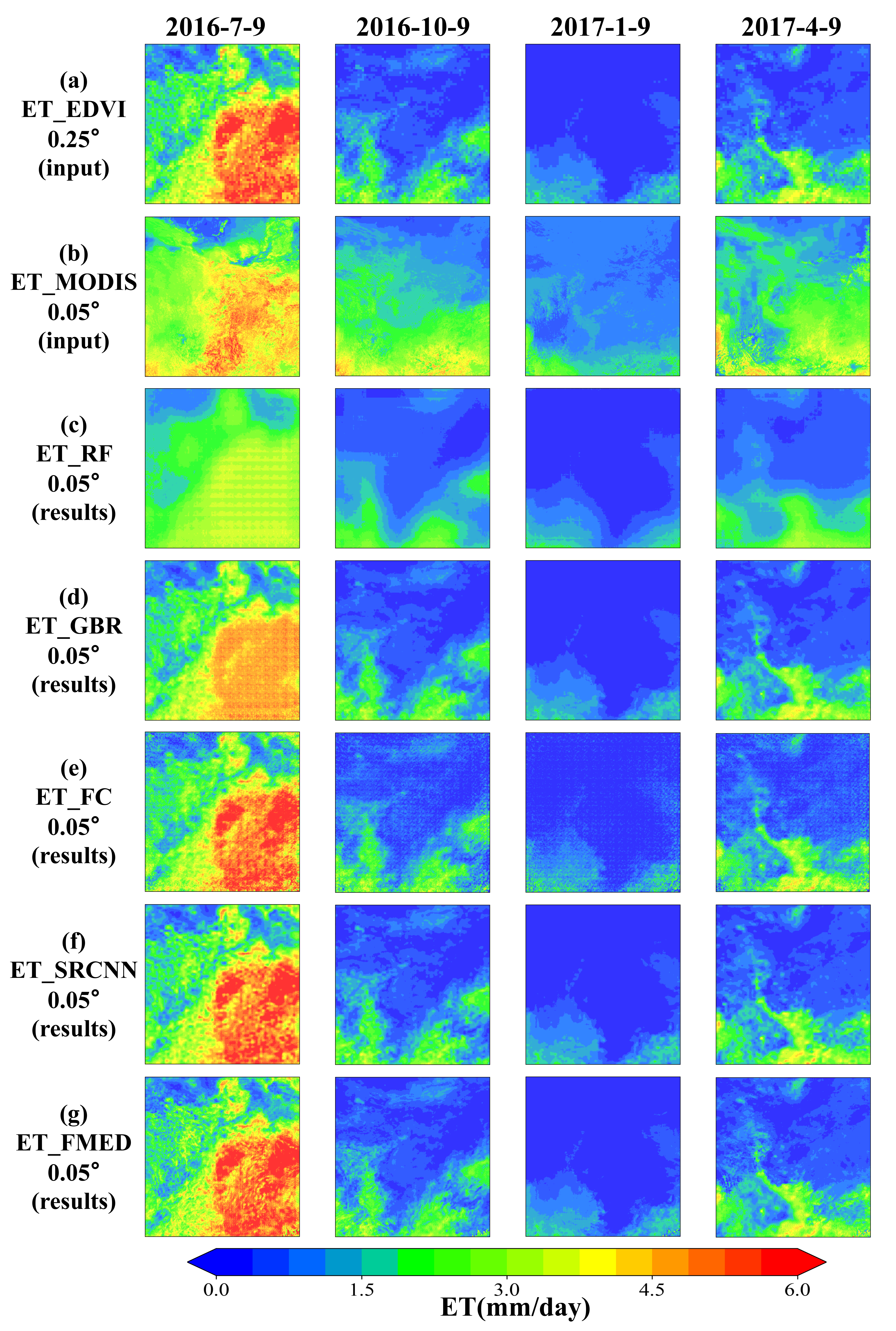 (a) 0.25° ET_EDVI;(b) 0.05° ET_MODIS;(c) 0.05° ET_RF;(d) 0.05° ET_GBR;(e) 0.05° ET_FC;(f) 0.05° ET_SRCNN;(g) 0.05° ET_FMED。