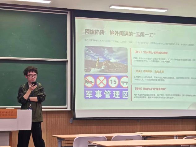 为强化警示效果,团课选取了国家安全部发布的多个典型案例进行深度剖析:从“闯入禁区的无人机”到“警惕军事藏品背后的违法交易”,再到“求职路上遭遇的间谍圈套”,这些发生在身边的案例生动揭示了境外势力渗透窃密的常见手段,敲响了安全警钟。同学们深刻认识到,维护国家安全并非遥远的“国家大事”,而是与每个人息息相关的日常责任,青年学子更要时刻保持警惕,筑牢思想防线。