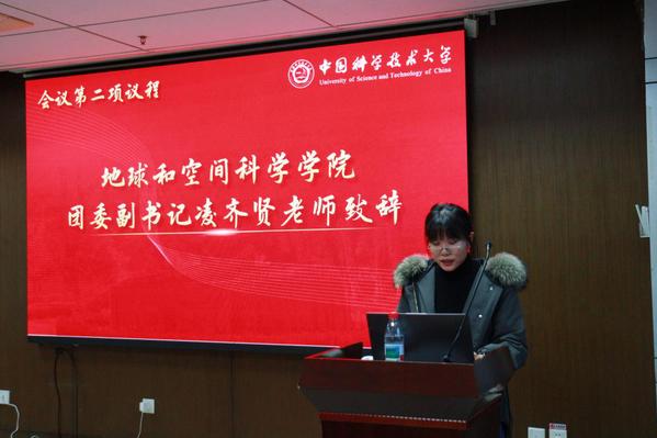 会议第二项,地空学院团委副书记凌齐贤致辞,她首先对大会的召开表示热烈祝贺,并向校研究生会、各学院代表以及全体与会同学致以亲切的问候。同时,凌老师充分肯定了地空学院研究生会过去一年在活动组织、服务师生等方面取得的亮眼成绩,并对院研究生会荣获“最佳院级研究生会”荣誉表示祝贺,同时她对地空学院研究生会未来的工作提出殷切希望。