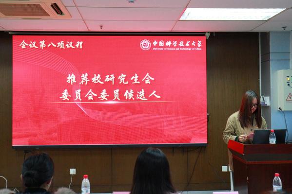 会议第八项,推荐校研究生会委员会委员候选人,通过民主推荐的方式,推荐张嘉芮、徐向阳、胡钦伦、国子孺共4名同学为校研究生会委员会委员候选人。