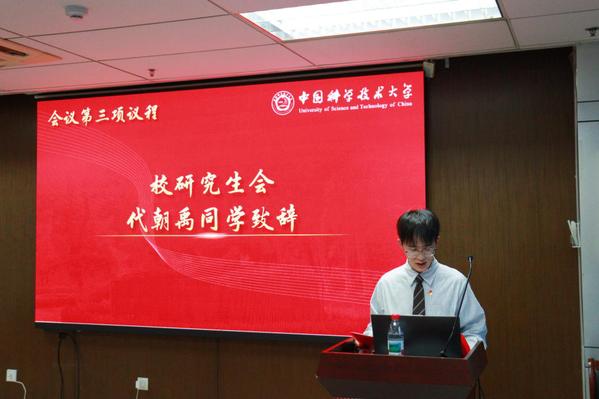 会议第三项,校研究生会代表联络部部长代朝禹致辞,代朝禹同学对本次大会的顺利召开表示热烈祝贺,向参加本次大会的全体代表、地空学院的广大研究生同学致以了诚挚的问候,并对地空研会一年以来的工作及成就表示了肯定。同时他也希望在未来的工作中,地空学院研究生会能够与校研会、其他院系研究生会深入交流合作,贯彻校、院、班三级联动机制,保持密切沟通,进一步为同学们服务。