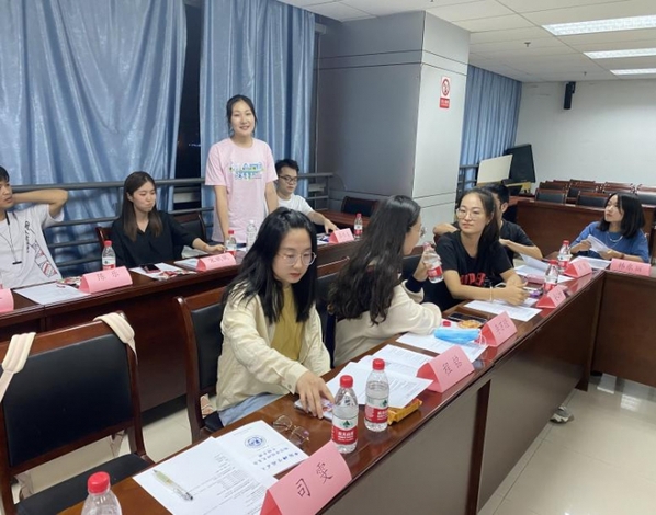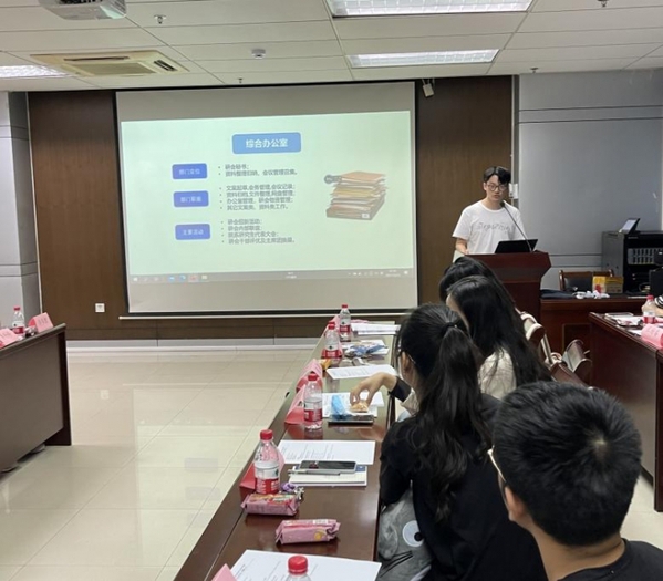 副部长葛东丽介绍了成员概况和工作内容。文艺体育部主要负责筹划与组织学院的大型文艺、体育赛事等活动,包括“美丽邂逅”子活动、羽毛球比赛等。