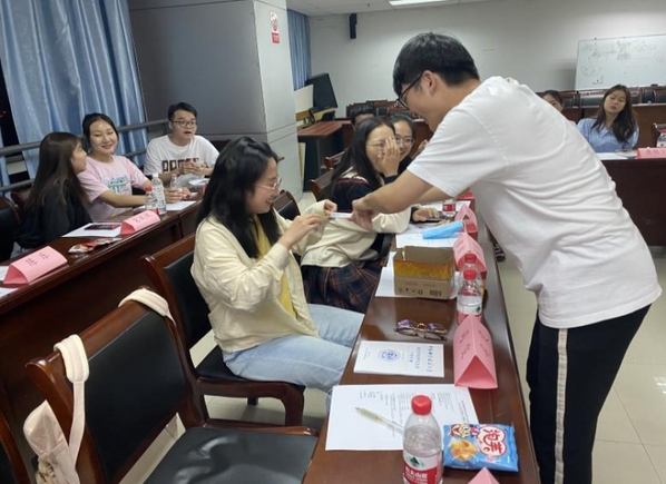 全体参会人员进行自我介绍,然后大家进行破冰小游戏—Q&A盲盒。参会成员分为7个组,每组3至4人,活动内容为听歌识曲。答对,该组成员任意指定另外一小组成员从Q&A盲盒池中抽取问题并回答,不想回答问题的,则进行才艺展示;若答错,该组成员每人抽取问题并回答。游戏结束后,猜对歌名的小组将会获得奖品。此次破冰小游戏,调动了现场氛围,让大家更快融入研会大家庭,从而增强团队的凝聚力。