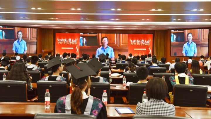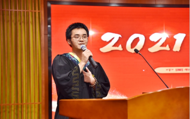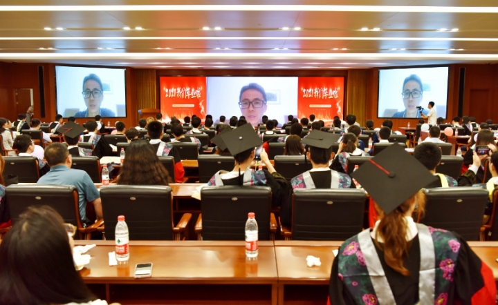 执行院长汪毓明教授目前在中央党校学习,线上发来致辞。汪院长表示,非常遗憾不能亲临今天的毕业典礼现场。汪院长说,明天大家就要踏上新的道路,创造新的征程。路是踩出来的,机会是创造出来的,没有路,我们可以去踩,没有机会,我们可以去创造。就像过去一百年,我们中国共产党带我们走出了一条逆境崛起之路,在这百年征程中,先辈们披荆斩棘,筚路蓝缕,在重重困难中,在半殖民地半封建社会中,闯出了一条新路,一条富强、民主、文明的新路。今年是非常值得纪念的一年,也是转折的一年。我们实现了第一个百年奋斗目标:全面建设小康社会,同时开启了第二个百年奋斗目标:全面建成社会主义现代化强国的新征程。过去的四五年,是你们成长和见证祖国蓬勃发展之路,在座的同学们,你们应该都成长在新世纪,求学在新时代,未来必将奋斗在新征程。