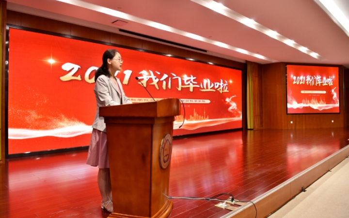 本科生班主任王景赟副教授发言。王老师说,2017年,她首次担任班主任。通过不断的学习和探索实践,在学院老师们的协助下,转眼四年过去了,2017级同学要毕业了。每位学生个性化的成长过程,令她心中感慨万千,人生是这么的不同,但各有各的精彩。现在同学们要毕业了,王老师希望同学们要多多沟通交流,多看看文史类书籍,要欣赏自己,肯定自己,要有积极奉献精神,多做公共服务,多为集体谋利,以责任为荣,要勇敢,相信同学们会越战越勇,路越走越宽。王老师说,下一段生活工作的最佳设计师是你们自己。希望大家在新的生活工作中清楚地认识自己,找到适合自己的节奏,用汗水做成的乐符谱写出自己喜欢的或优美或激昂的人生之曲。而她对大家的期望是简简单单的,希望同学们健康、快乐、幸福!