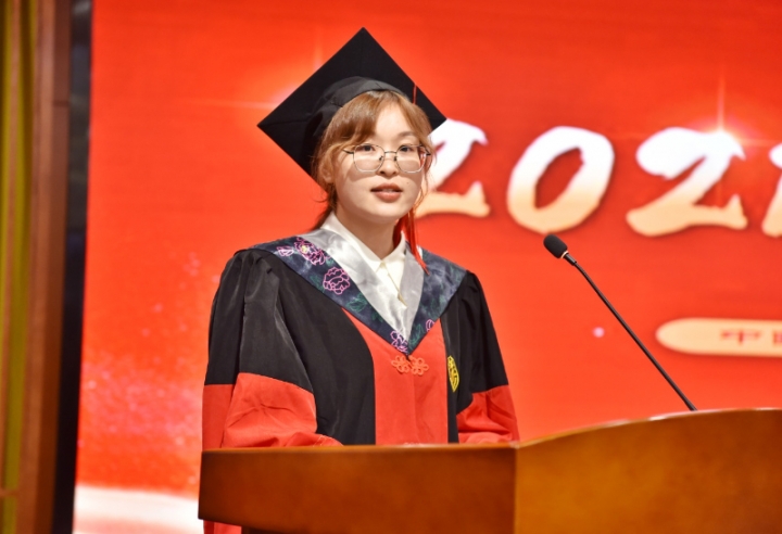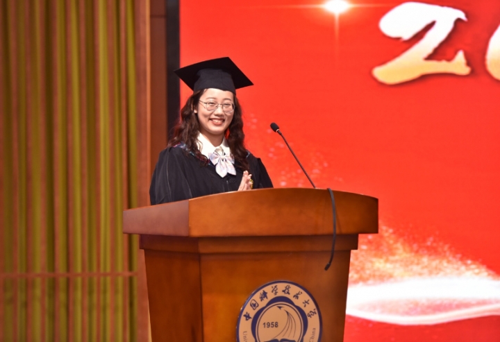 研究生毕业生代表闫上升发言。闫上升表示自己作为一名毕业生,心情非常激动,她诚挚地感谢老师和同学给予的帮助。她表示,通过科研的锻炼,我们得到的不仅的科研上的成果,更是心性的锻炼。也正是有了这些磨练,才给了我们勇气和能力去面对以后道路上的种种未知和挑战,让我们更加成熟,更加从容地面对生活。正值青年的我们,应学会逆境而上。闫上升说:“从今天起,我们即将结束学生生涯,告别辛勤培育我们的老师,朝夕相处的同学,告别最熟悉的校园,告别彻夜长亮的地空楼,开启一段崭新的人生。但不管走到哪里,我们都是科大人,一起传承着科大精神,为母校争光添彩,我们可以平凡但决不平庸,他日必将顶峰再会!”