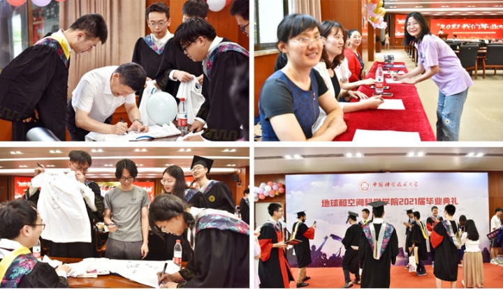 6月26日下午,中国科学技术大学地球和空间科学学院2021届毕业典礼在东区师生活动中心5楼国际会议厅举行。地球和空间科学学院党委书记刘斌和导师代表雷久侯等20多位老师,100多名2021届本科、硕士、博士毕业生以及部分学生家属参加了本次毕业典礼。仪式由副院长陶鑫教授主持。
