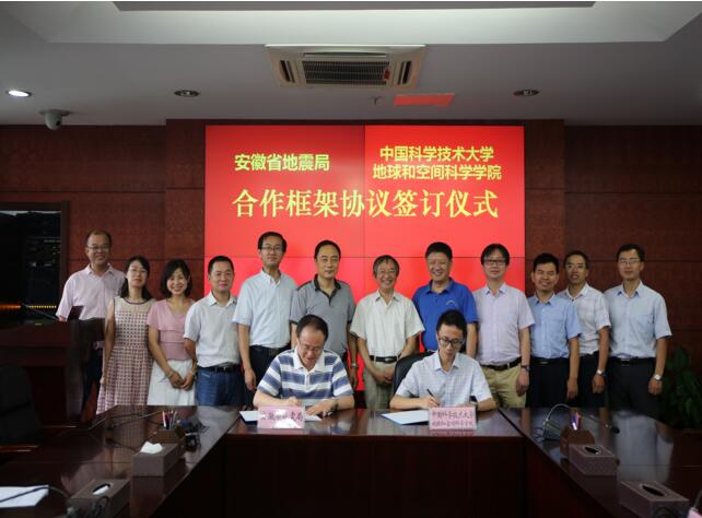 8月12日上午,中国科学技术大学地球和空间科学学院与安徽省地震局签订合作框架协议。中国科学技术大学党委常委、副校长周先意,安徽省地震局党组书记、局长刘欣,党组成员、副局长张有林出席协议签订仪式,中国科学技术大学地球和空间科学学院执行院长汪毓明,党委书记刘斌,副院长姚华建,专业主任吴小平、雷久侯,省地震局办公室、人事处、监测预报处、预报中心、信息中心负责人和有关人员参加了仪式。