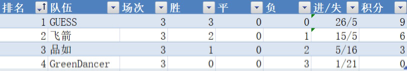 两轮过后GUESS已经提前夺冠,轻松迎战GreenDancer。而第一次遇见这种等级的强队,GreenDancer显得有些慌乱,后防的问题再度暴露出来,丢的14颗球就当做是他们交的学费了。另一边飞箭的门将依然稳健,久攻不下的品如阵型过于前压导致屡次送给对方单刀机会,上半场丢球过多,即使下半场稳住局面依然以1:7落败。