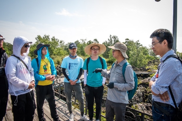 抵达景区后,科考队成员沿栈道游览风景优美的五大连池。带队老师不时穿插讲解,戴立群老师结合实物向同学们介绍了绳状熔岩、熔岩结壳、熔岩塌陷等火山地质现象的特点及其成因。下午,在老黑山脚下的“翻花石海”景区,同学们看到了块状熔岩崎岖不平犹如沧海波澜的壮阔景象,并在陈仁旭老师的讲解下理解了石海的形成机理。随后,科考队登上老黑山,俯瞰火山口,实地了解了火山渣锥的结构。最后,一行人乘车前往火烧山脚下,水汽与岩浆共同作用形成的喷气锥碟令人称奇,同学们也很快掌握了分辨喷气锥和喷气碟的方法。