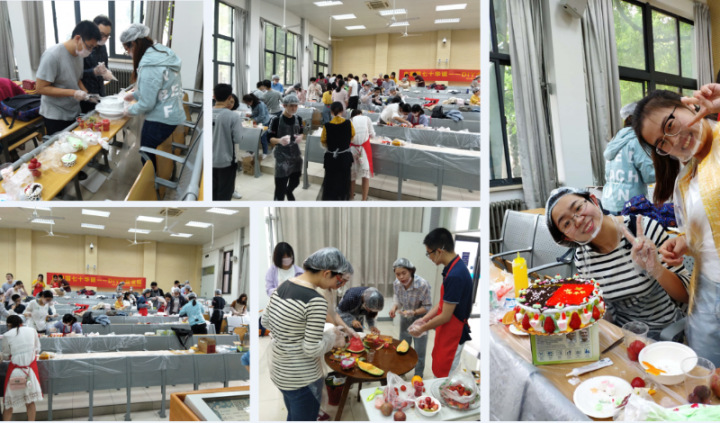 同学们陆陆续续赶在活动开始之前进场,并在工作人员的指导下领取蛋糕胚、奶油、水果等食材以及转盘、小刀、手套、口罩等用具。活动以小组为单位进行,自愿组队,2至5人为一小组。许多小组分工明确,有同学负责抹奶油,有同学且水果,有同学负责摆形状……各个小组都能契合“爱国”主题,还有小组把“中国科大”与“爱国”相结合,完美诠释“红专并进”的校训。