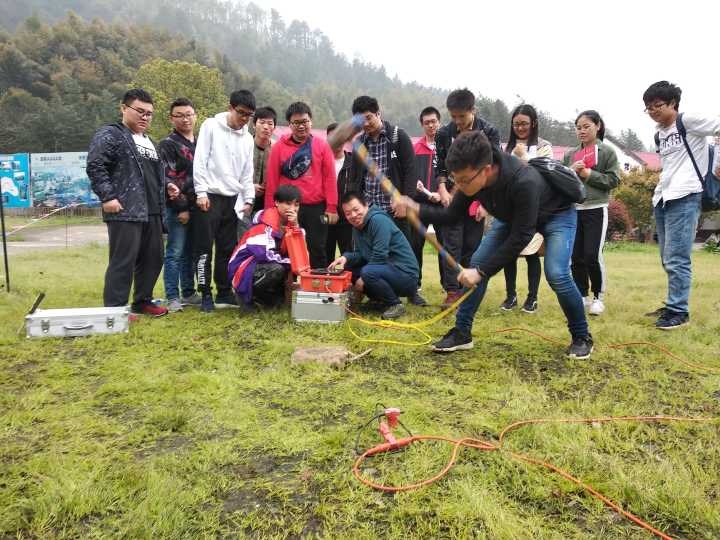 随后同学们前往宝山陶采坑,在这里,院长和老师为我们讲解了地球物理勘探的基本知识,以及磁力勘探和地震勘探技术的设备使用。以及环境科学的便携仪器使用,在这里同学们测量了水的浊度、PH、空气的几种污染物含量如氮硫氧化物,以及PM2.5和实时环境噪音。在这如画的风景中,同学们的学习热情格外高涨,天色渐晚,同学们前往铜陵市住宿。