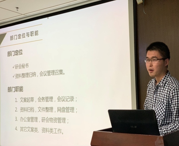 大会第二项为各部门风采展示及工作进展情况介绍。首先介绍的是综合办公室主任刘东宽,他将部门定位为“研会秘书”,总结出办公室的主要职能为文案起草,会务管理,会议记录,资料归档,研会物资管理,研会办公室整理等,承办的活动包括研会招新活动、研会内部素质拓展活动、院研究生代表大会、期末总结大会等,同时他简要介绍了办公室的工作进展以及接下来的工作安排。接下来介绍的是信息宣传部部长汪海,汪海介绍了信息宣传部和外联合作部的情况,回顾了两部门共同办的科学岛秋游活动、冬至包饺子活动、女生节活动等,并指出今后两个部门会继续合作,携手进步。作为信宣部的负责人,汪海还指出信宣部主要负责微信公众号的管理和各部门承办活动的宣传,并对新成员的加入表示热烈欢迎,希望大家能够齐心协力为研会、院系做更多的事情。
